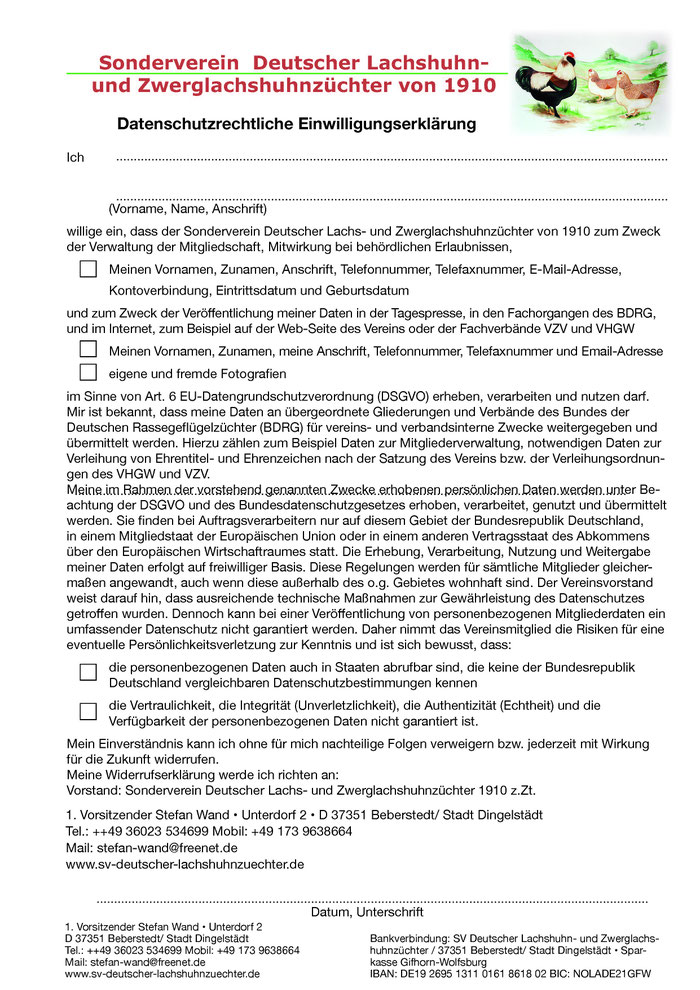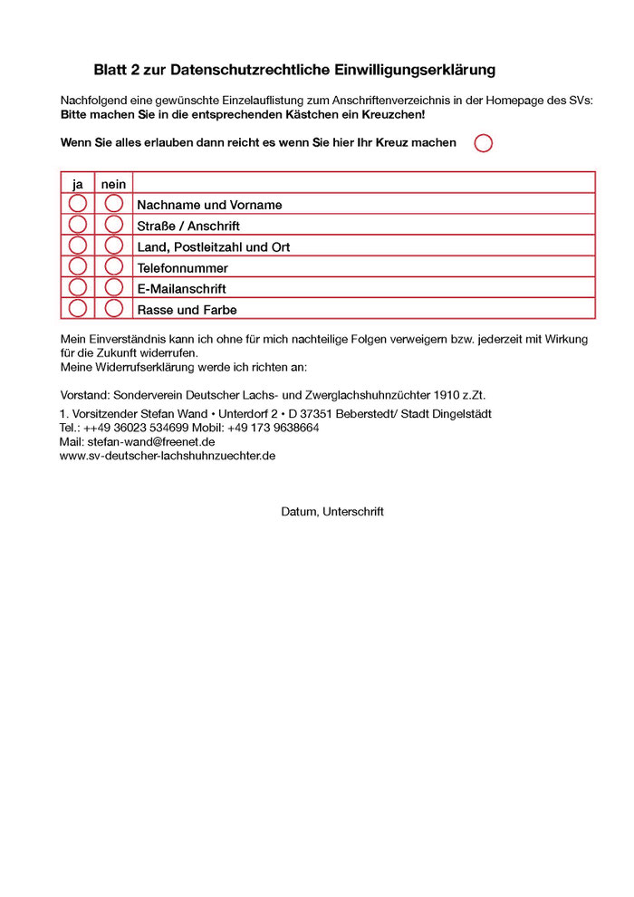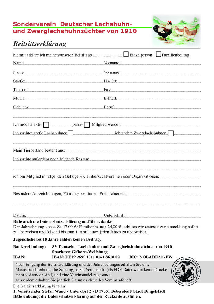 Beitrittsformular / Anmeldung an den SV Deutscher Lachshuhn- und Zwerlachshuhnzüchter von 1910